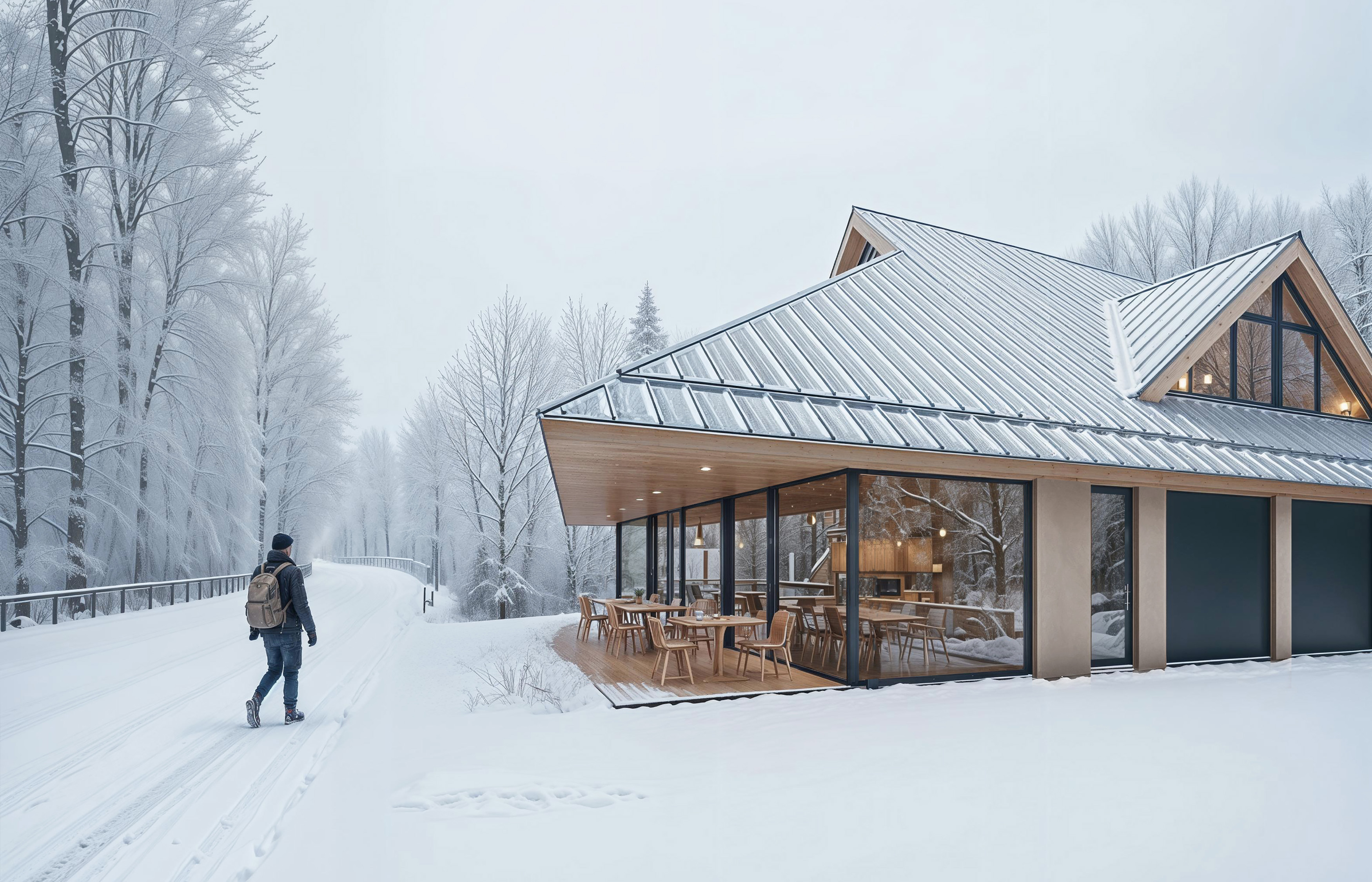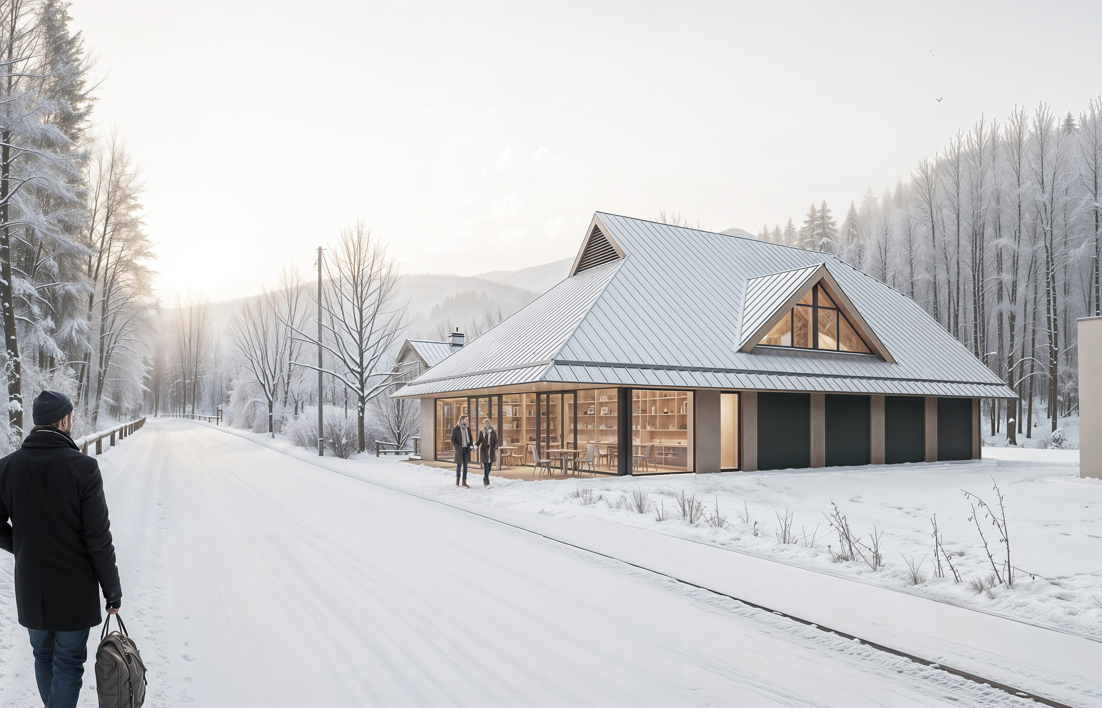 Avec un soubassement surmonté d’une grande toiture chapeau, la construction se veut une interprétation contemporaine des grandes fermes emblématiques du haut-Doubs.