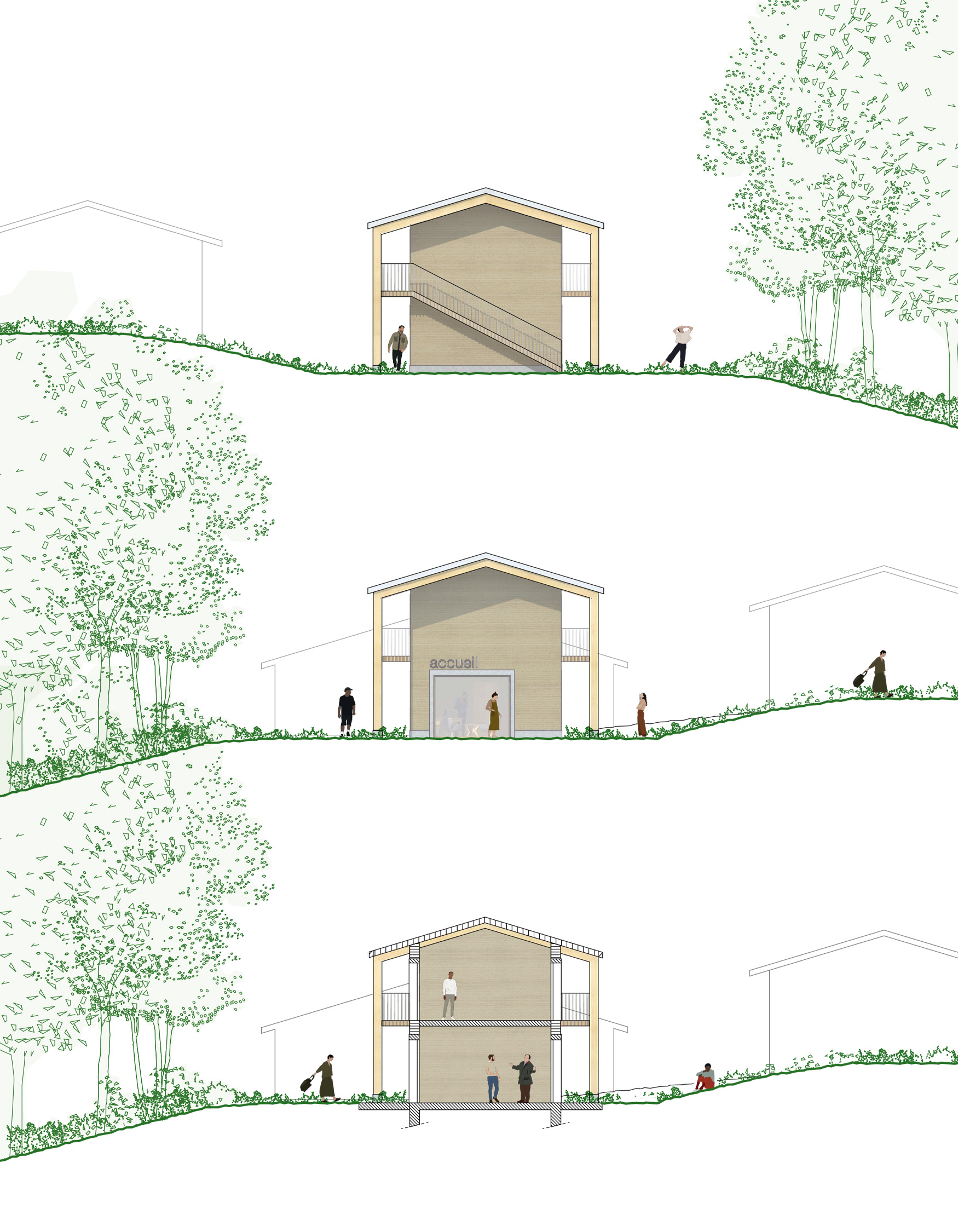 Le bâtiment se compose d’un corps principal sur deux niveaux, dont la périphérie est occupée par des coursives et auvents. Ces éléments rapportés de grande hauteur donnent une échelle verticale à la construction, tout en offrant des espaces protégés sur le pourtour.